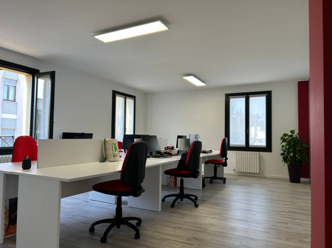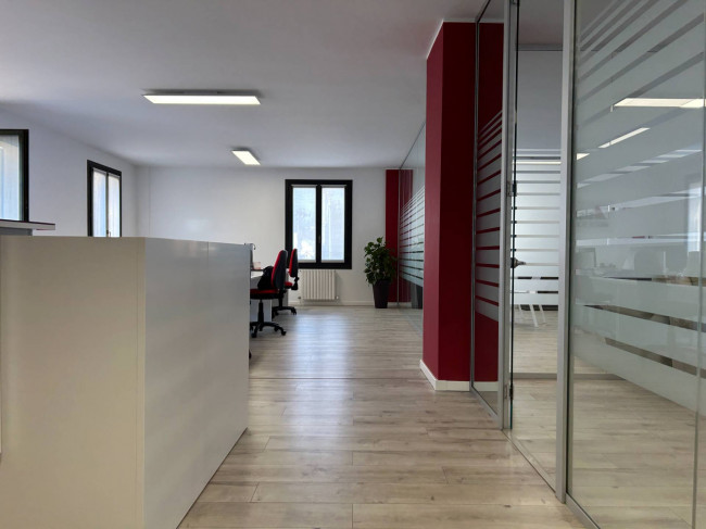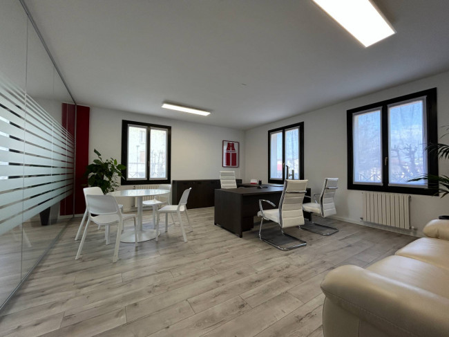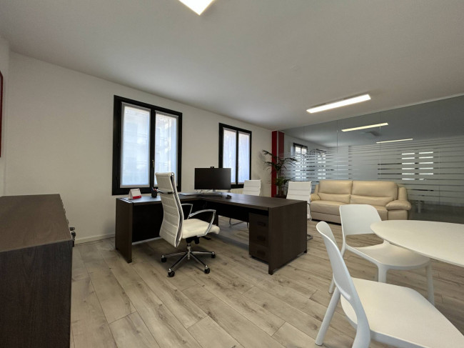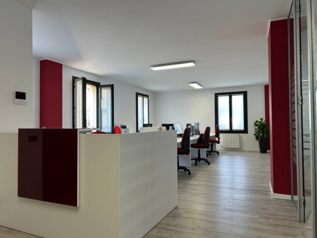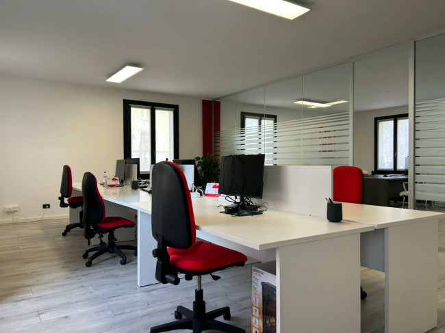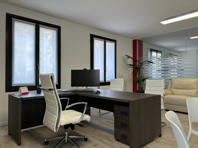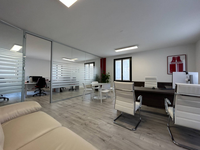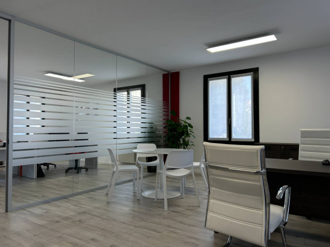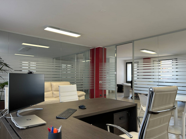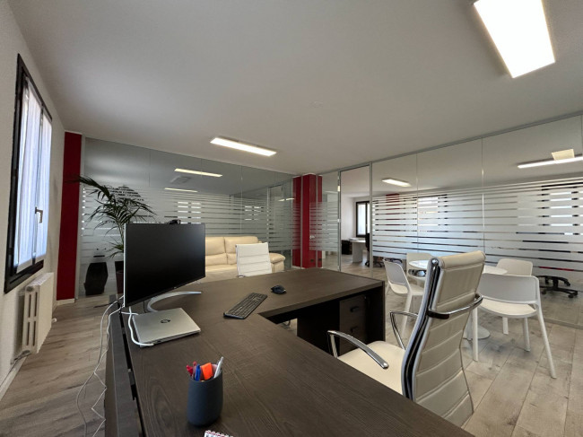 L'ufficio, rinnovato di recente, ha un bagno con un antibagno ed un locale caldaia e si presenta già strutturato e suddiviso da pareti in vetro, scrivanie e mobilio da ufficio.