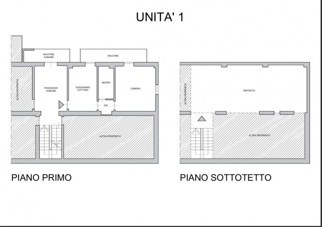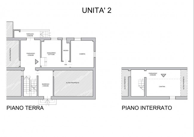 Le due soluzioni, completamente da ristrutturare, sono una al piano terra e una al primo piano e presentano la stessa distribuzione interna: