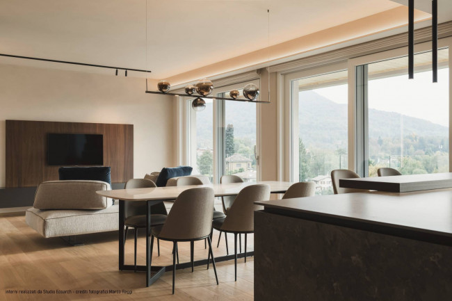 Varcato l'ingresso dal disimpegno, si accede all'area giorno composta da un salone collegato a una cucina a vista: un grande open space ideale per vivere momenti di relax e convivialità, che si affaccia direttamente sul giardino e regala una splendida vista panoramica sulla Valcuvia. La zona notte è ben organizzata e preservata: tre camere da letto accoglienti e due bagni completi - una distribuzione adatta sia alla famiglia sia a chi ama ospitare con eleganza. Completano la proprietà una cantina pertinenziale e la possibilità di acquistare un box doppio, offrendo così comfort e funzionalità anche per l'auto e lo storage.