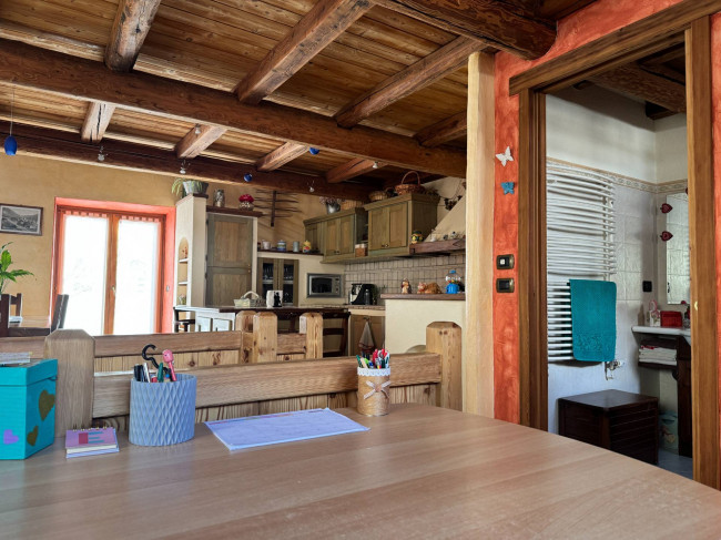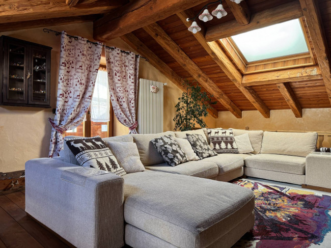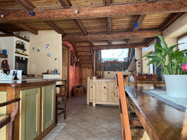Al piano superiore, un'ampia zona giorno con cucina a vista e soggiorno accoglie la luce naturale, trasformando ogni finestra in un quadro dedicato alla maestosità alpina. Qui il vivere in montagna rivela la sua essenza più pura.