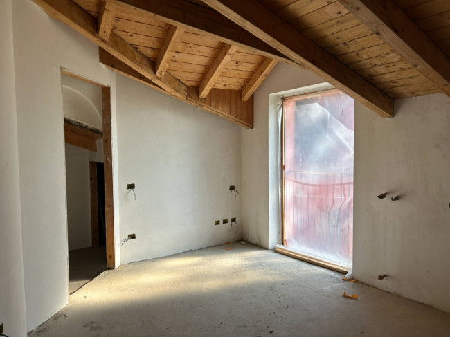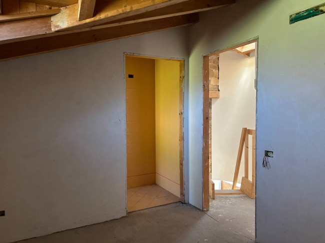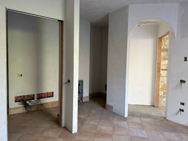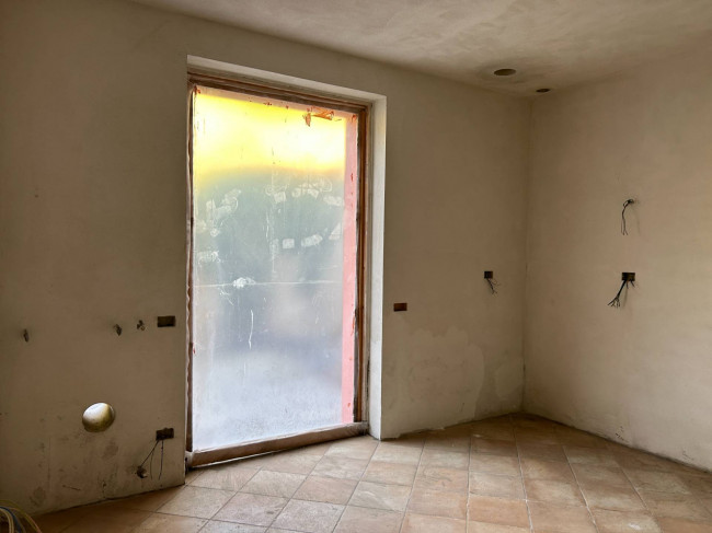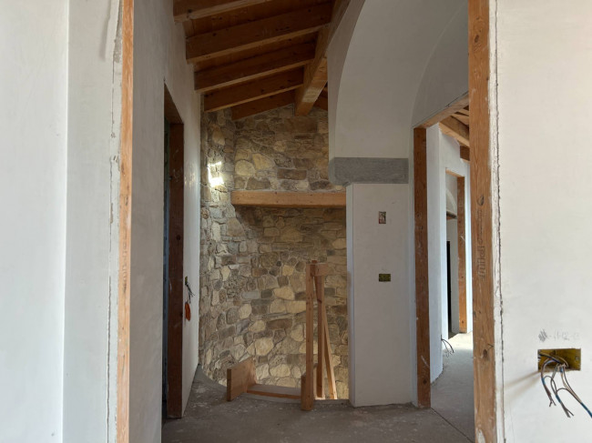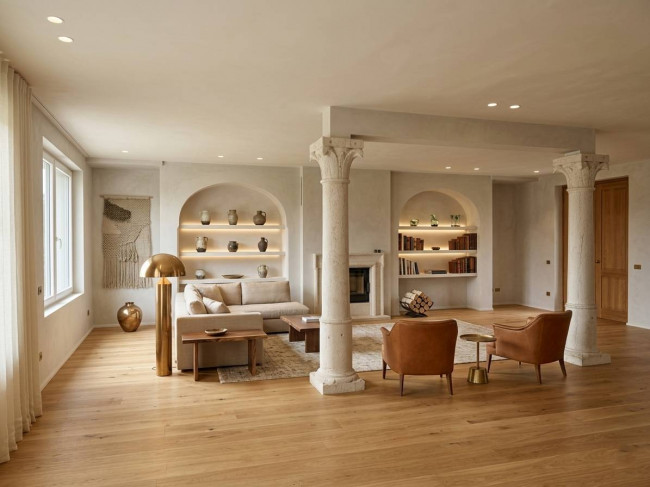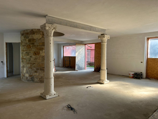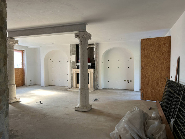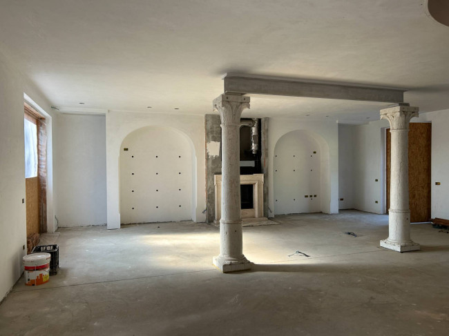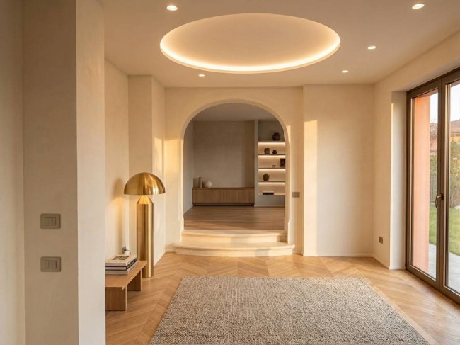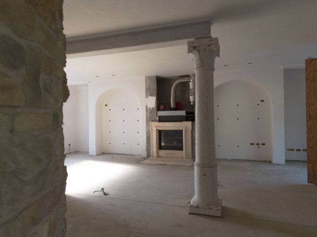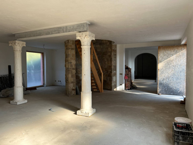 Il cuore della casa si sviluppa al piano terra, dove l'ampio salone colpisce per la luminosità delle grandi vetrate e per i dettagli storici: tre arcate in muratura e colonne antiche in marmo definiscono lo spazio, completato da un camino tecnologico integrato. La zona giorno include una cucina abitabile con dispensa e cantina vini, mentre la zona notte padronale offre una master room con cabina armadio, bagno dedicato e una pratica lavanderia.