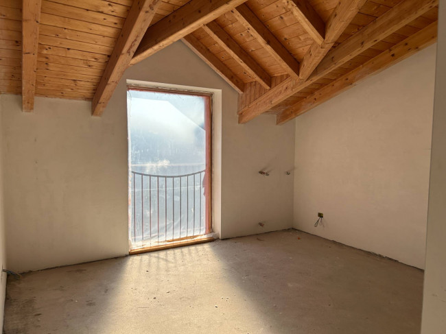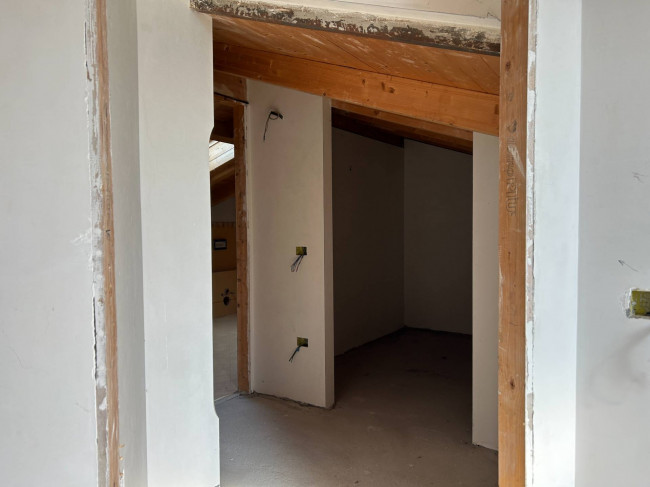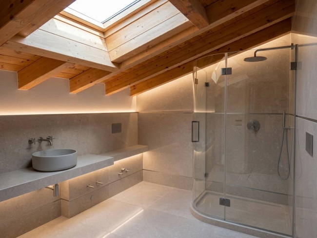 Il primo piano ospita la zona notte superiore, con due camere matrimoniali entrambe dotate di bagno ensuite, e un terzo ambiente versatile perfetto come studio o ulteriore camera. Il vano scala, rivestito in scenografica geopietra, e gli ampi sottotetto ad uso ripostiglio ottimizzano ogni centimetro della metratura.